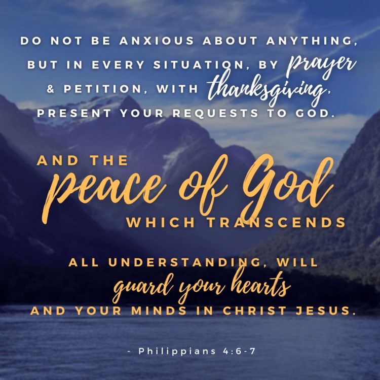 Scripture: Philippians 4:6-7 “Do not be anxious about anything, but in every situation, by prayer and petition, with thanksgiving, present your requests to God. And the peace of God, which transcends all understanding, will guard your hearts and your minds in Christ Jesus.”