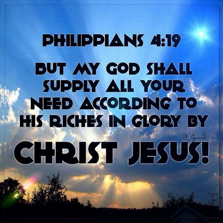 Scripture: Philippians 4:19 And my God will meet all your needs according to the riches of his glory in Christ Jesus.