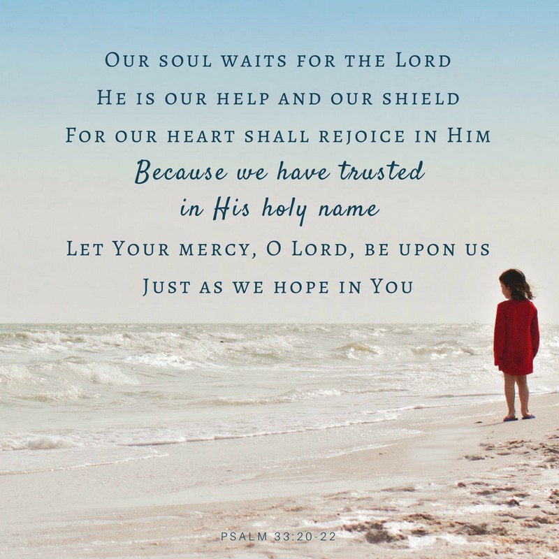 Scripture – Psalm 33:20-22 We wait in hope for the Lord; he is our help and our shield. 21 In him our hearts rejoice, for we trust in his holy name. 22 May your unfailing love be with us, Lord, even as we put our hope in you.